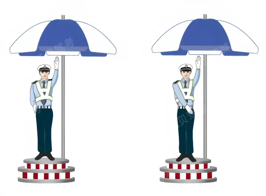 A、选择在路边不妨碍通行的地方停放B、选择在标志前方安全的位置停车C、只要没有禁止停车标线的路段都能停车D、在这段道路上的任何地方都不能停车 - 6. 图中这组交警手势是什么信号?