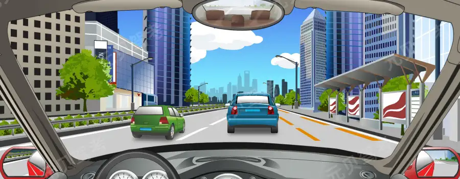 正确错误 - 3. 如图所示,在城市道路上,遇到这种情况需要超车时,可以直接开启右转向灯,借公交车道行驶。