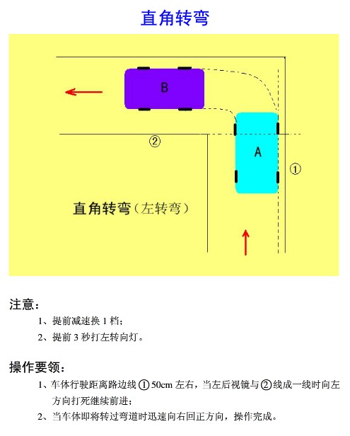 操作要领:右转弯,车体靠近左路沿,车体左侧距离路沿60cm向右转方向;左转弯刚好相反,车体靠近右路沿,车体右侧距离路沿600cm向左转方向。